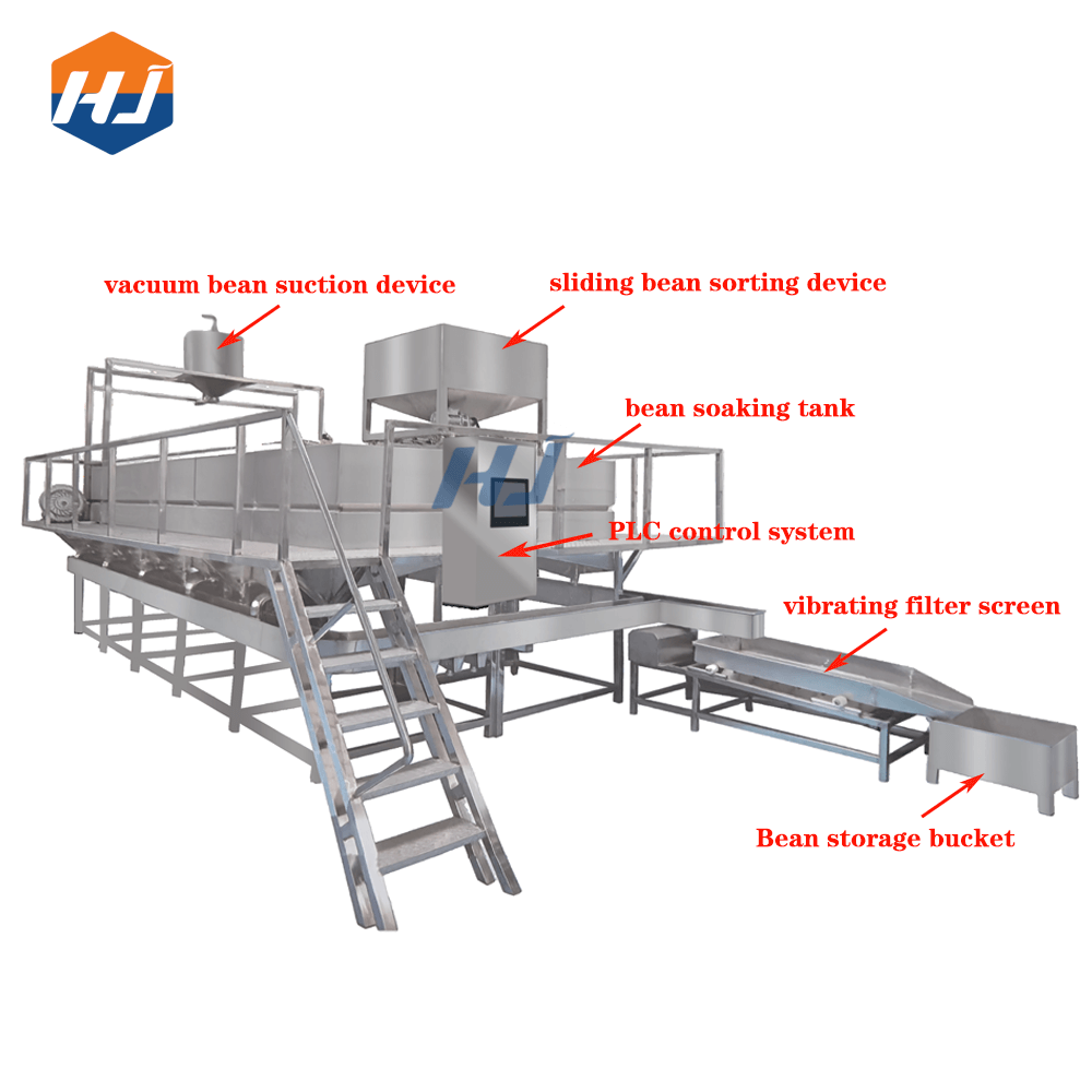 An automatic soybean soaking and washing machine can vacuum-suck soybeans, add water quantitatively, repeatedly wash and soak them for a set time. It uses compressed air injected into the water to agitate the soybeans, ensuring thorough soaking and washing, and allowing damaged soybeans and other impurities to float on the surface. The soaked soybeans and water flow down the trough to a vibrating filter screen, which removes stones, sand, and impurities. The properly soaked and clean soybeans will not affect the taste and quality of soy milk and tofu.
