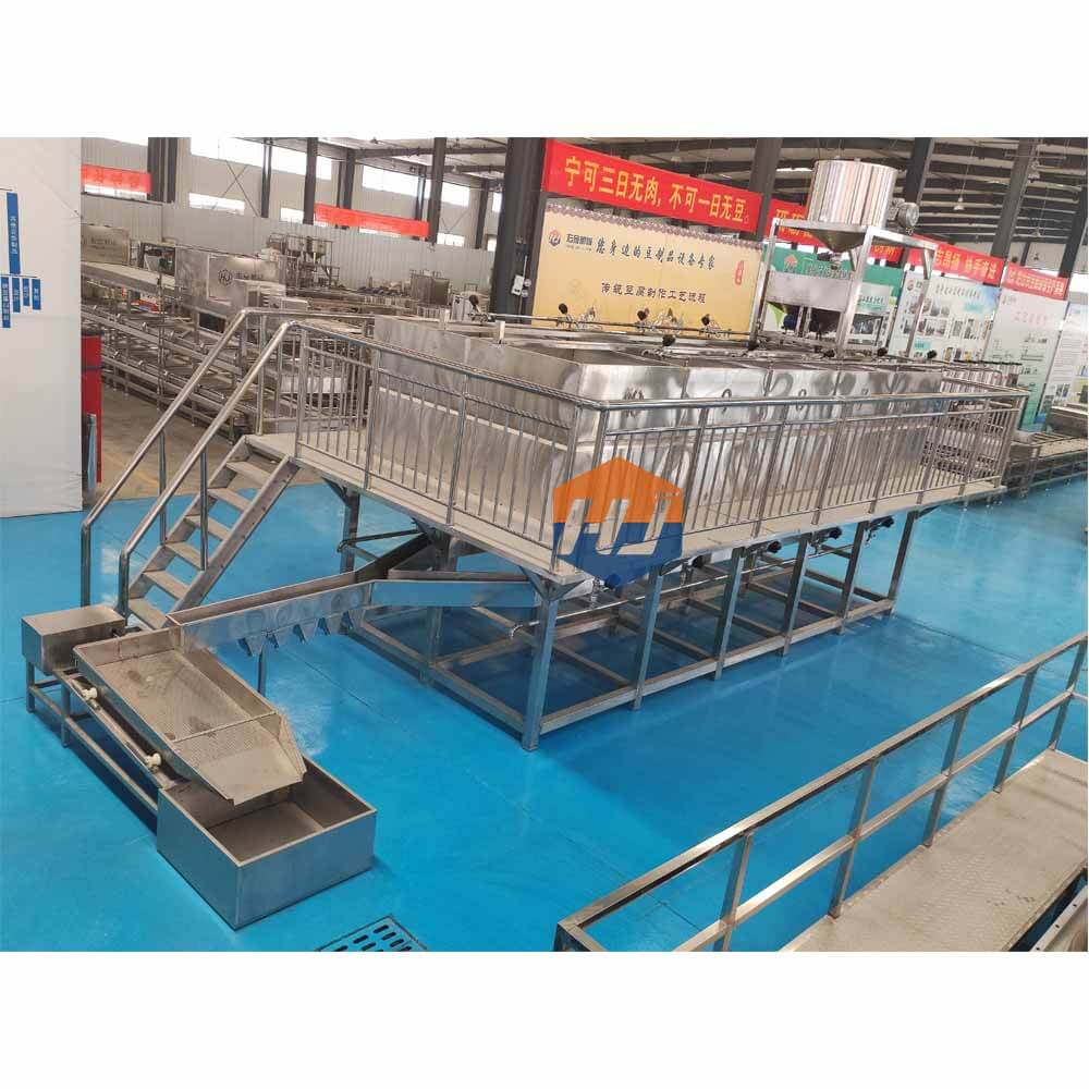 The bean washing and soaking equipment is the first step in the factory’s soybean product manufacturing process. The complete system includes a vacuum bean suction device, storage hopper, sliding bean distribution device, bean distribution track, soaking tank, stainless steel operating platform, stainless steel stairs, PLC automatic control system, automatic water filling system, water level detection device, aeration device, trough filtering device, and vibrating filter screen. The equipment has washing, soaking, draining, and filtering functions. The entire machine is made of stainless steel, except for special parts.