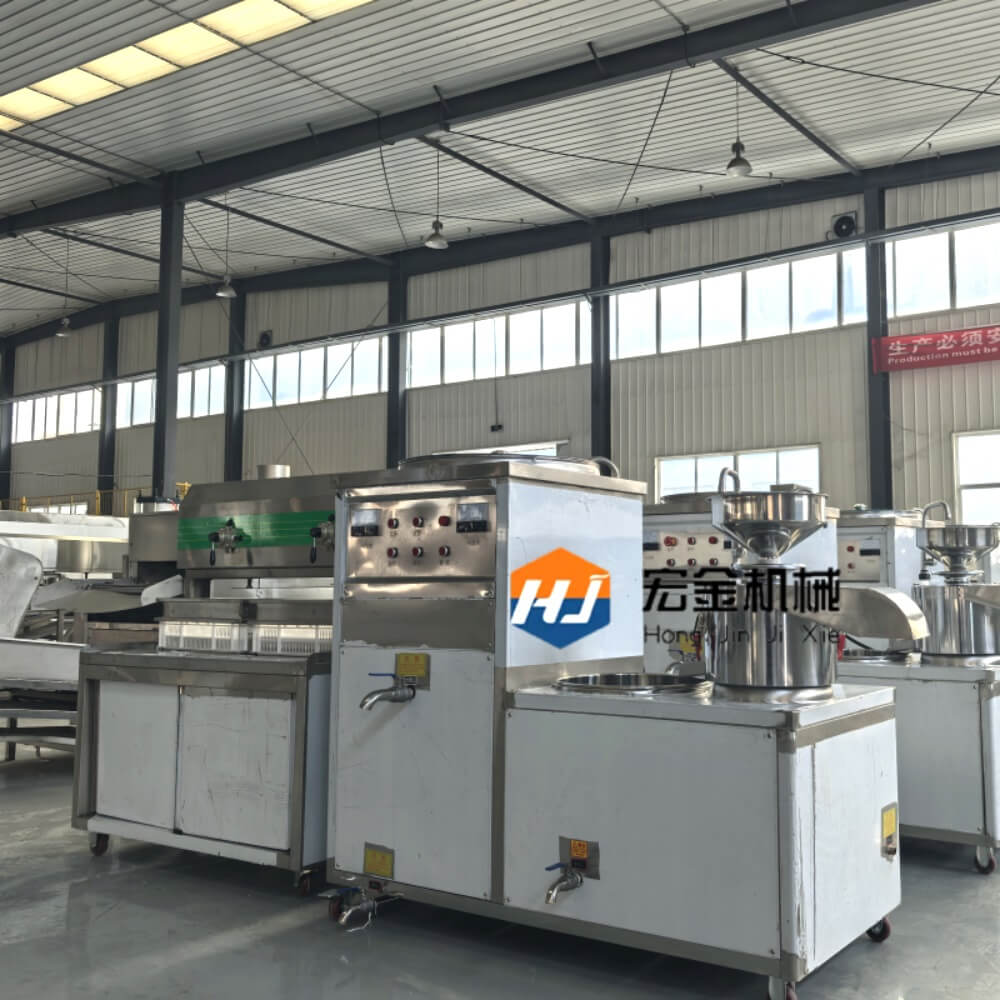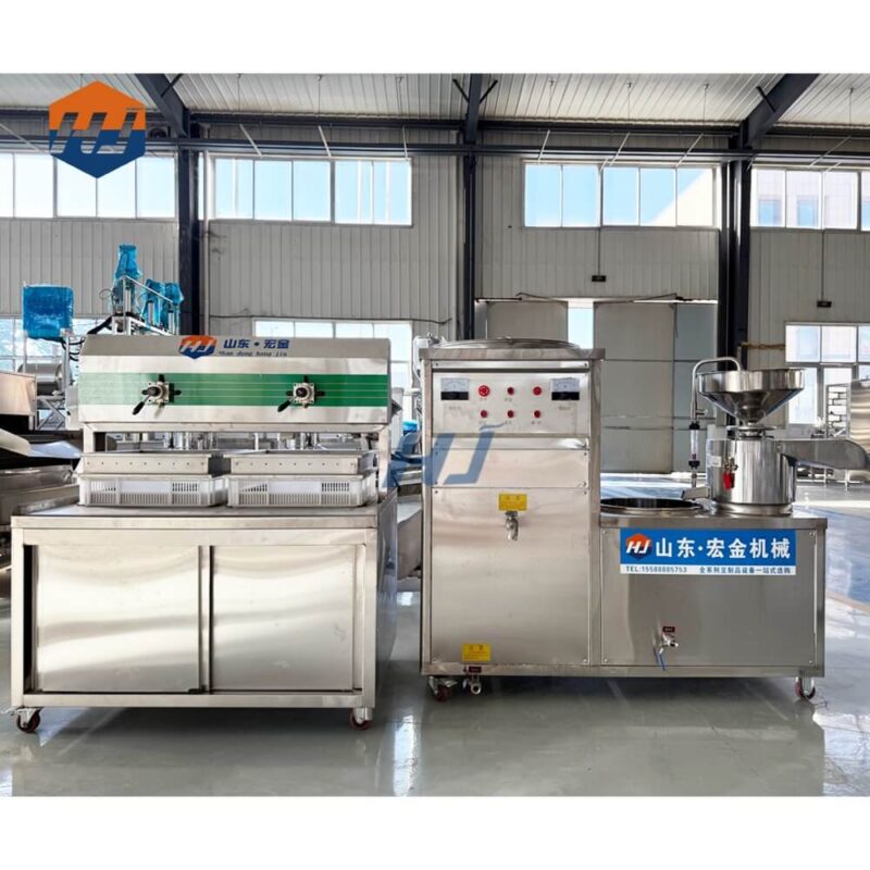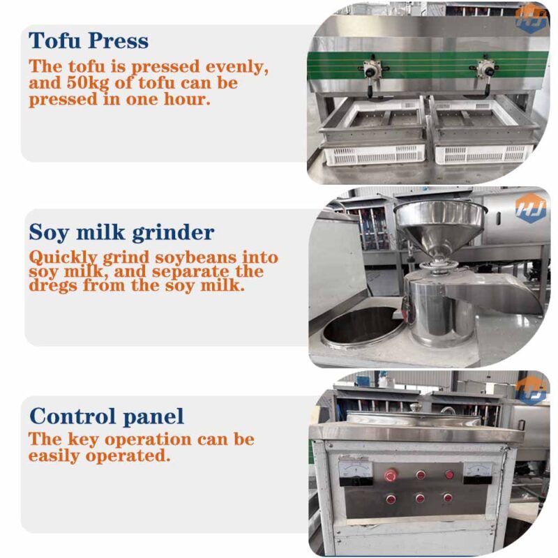 Soybeans are manually added, and the machine automatically separates the soy milk and soy pulp. The soy milk flows into the raw soy milk tank. When cooking, a button can be pressed to pump the raw soy milk into the cooking tank. Grinding and cooking can be done simultaneously to improve efficiency. The cooked soy milk flows out through the outlet and is collected in a stainless steel container. A coagulant is then added to the soy milk to make tofu pudding. The tofu pudding is scooped into a tofu pressing basket, and the machine is turned on to press the tofu.