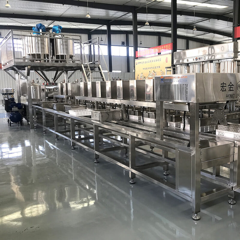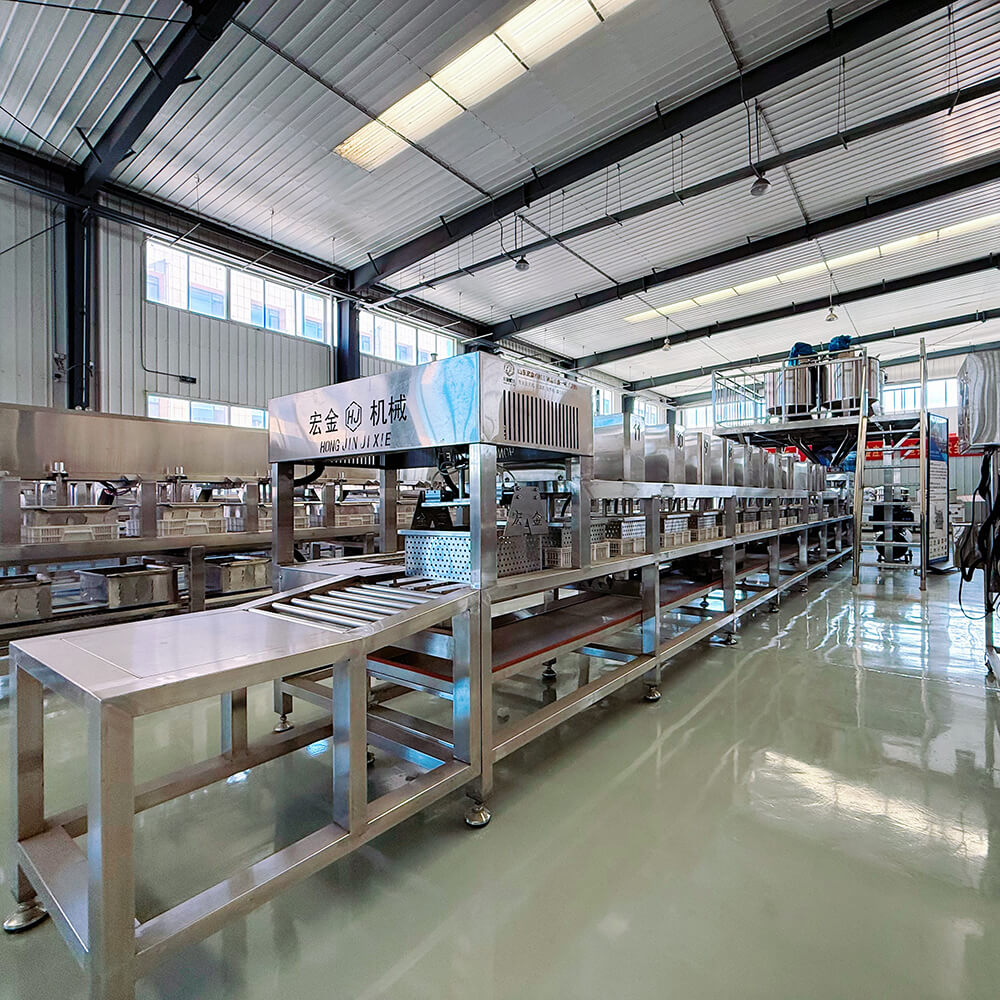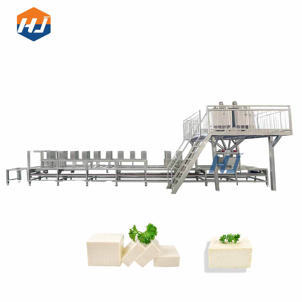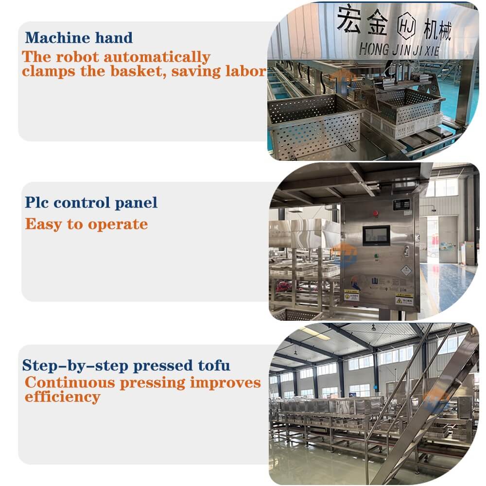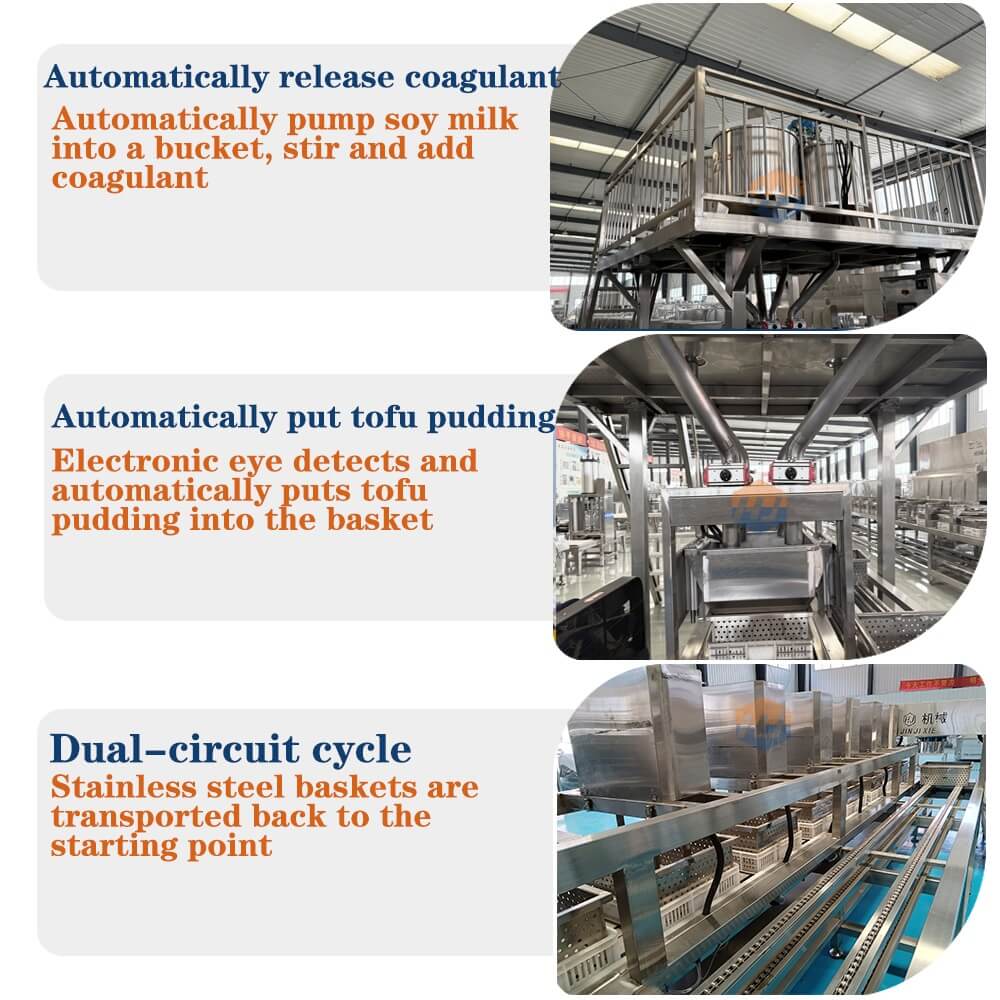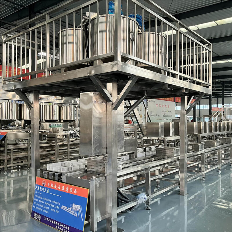 Climbing the stairs, you’ll find a soy milk storage tank on the platform. Next to the tank is a device that automatically adds coagulant, turning the soy milk into tofu pudding. The machine automatically opens a valve, and the tofu pudding falls from the pipe into a tofu pressing basket. The person then manually closes the lid, and a conveyor belt transports the basket to a pneumatic press. The machine automatically presses the tofu using a step-by-step process, resulting in pressed tofu at the end of the conveyor belt. The tofu is then removed, and the lid and pressing basket are placed on the lower conveyor belt and transported back to the beginning of the machine.