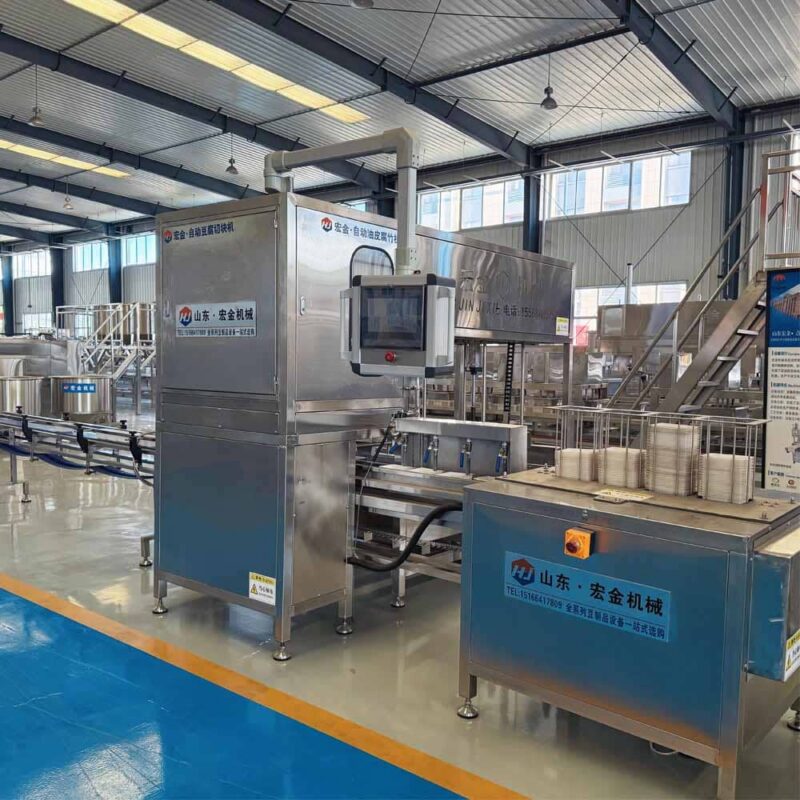 During operation, whole tofu slabs are manually placed flat at the front end of the underwater conveyor belt. The machine then automatically pushes the tofu forward in water and cuts it into uniformly sized pieces using a precise cutting mechanism. After cutting, the tofu pieces are gently separated in the water and smoothly dropped into individual packaging boxes below. Operating entirely in a water environment reduces friction and product damage, ensuring clean cutting surfaces and intact tofu shape. The machine can be seamlessly connected with a tofu packaging machine to complete automatic sealing and production date printing, significantly reducing labor requirements while improving efficiency and product consistency. It is an essential unit in modern automated tofu production lines.