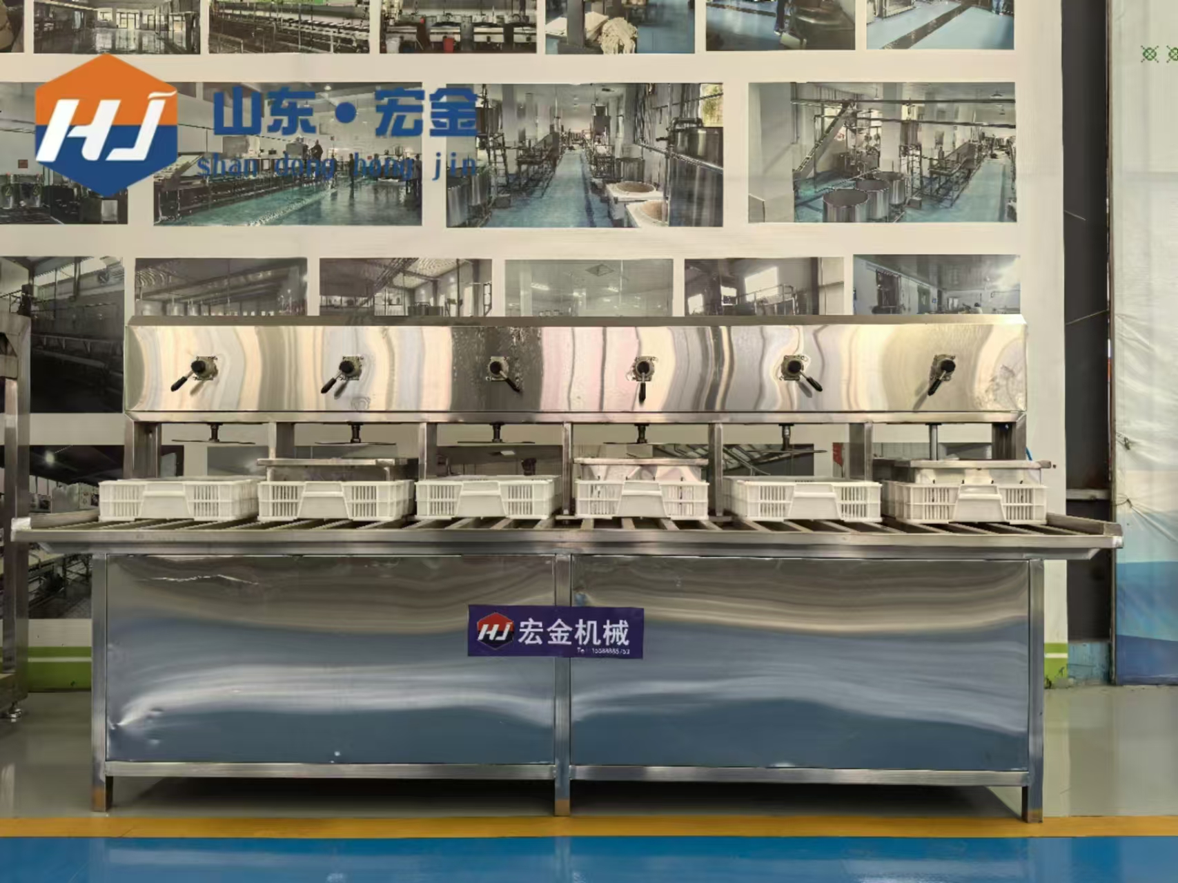 After soybeans are ground, boiled, filtered, and coagulant is added, workers scoop the tofu curd into a tofu pressing basket, cover it with a cloth, put on a lid, and turn on the air compressor to press it. Then the above process is repeated, and the tofu is produced in about ten minutes. Depending on the desired firmness of the tofu, the pressing time can be reduced or extended.