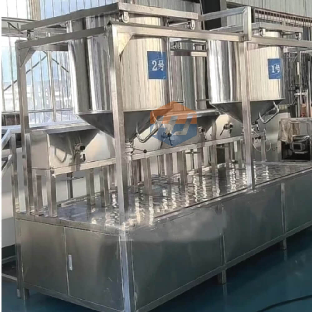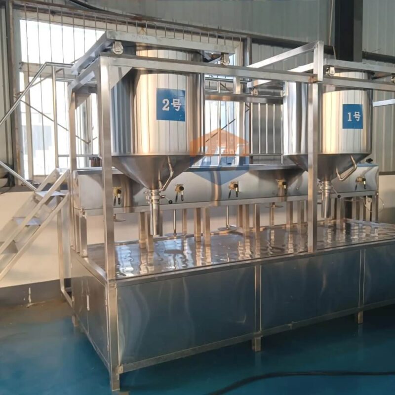 No manual bending over to scoop the tofu pudding is required. Instead, workers walk up the stairs and add coagulant to the two soy milk buckets above the machine. The two buckets for holding the tofu pudding move left and right via sliding rails. Simply open the tofu pudding release switch to easily pour the tofu pudding into the tofu pressing basket. Then, cover the basket, push it under the air press, and turn on the air press to press it. The tofu is produced in about ten minutes.