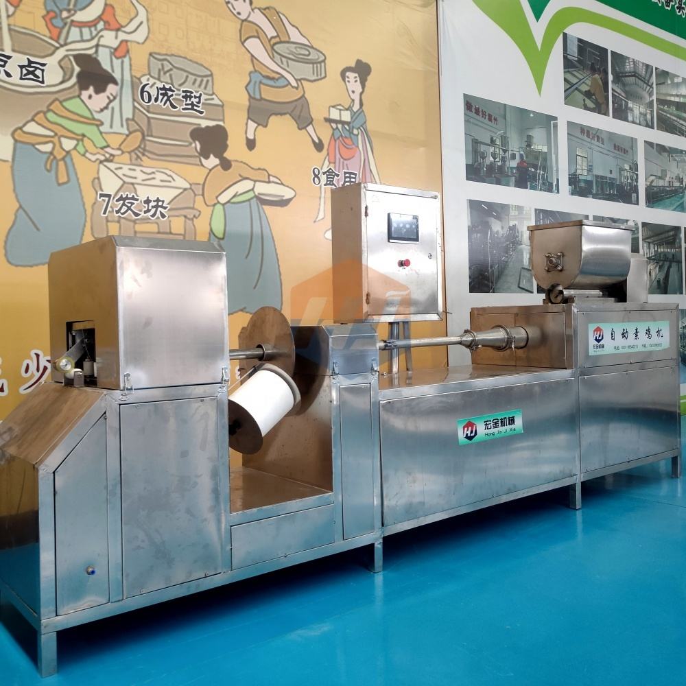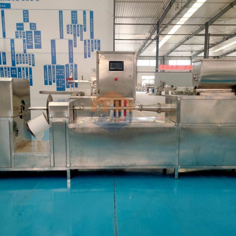 The vegetarian chicken machine is a specialized piece of equipment that reprocesses crushed or scrap tofu skin into cylindrical vegetarian chicken shapes. The tofu skin is first crushed, then fed into an extrusion molding system where it is compressed and shaped under high pressure to form a dense, chewy cylindrical vegetarian chicken. The entire machine is made of food-grade 304 stainless steel, ensuring hygiene, safety, and easy cleaning. It also allows for continuous production, significantly improving raw material utilization and production efficiency. This equipment is particularly suitable for tofu skin manufacturers, vegetarian food factories, and soy product processing plants seeking to reuse scraps.