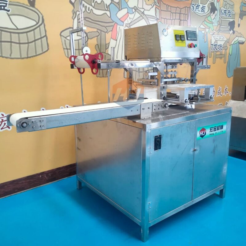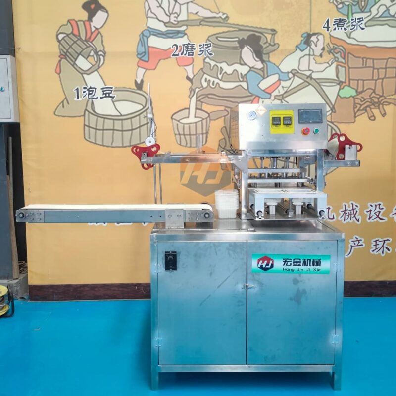 The operator places the pre-filled tofu trays onto the conveyor belt, and the machine automatically transports them to the sealing station. Then, the operator simply inserts the tray or boxed tofu into the designated position, and the machine completes the entire process of film sealing, heat sealing, and cutting automatically.